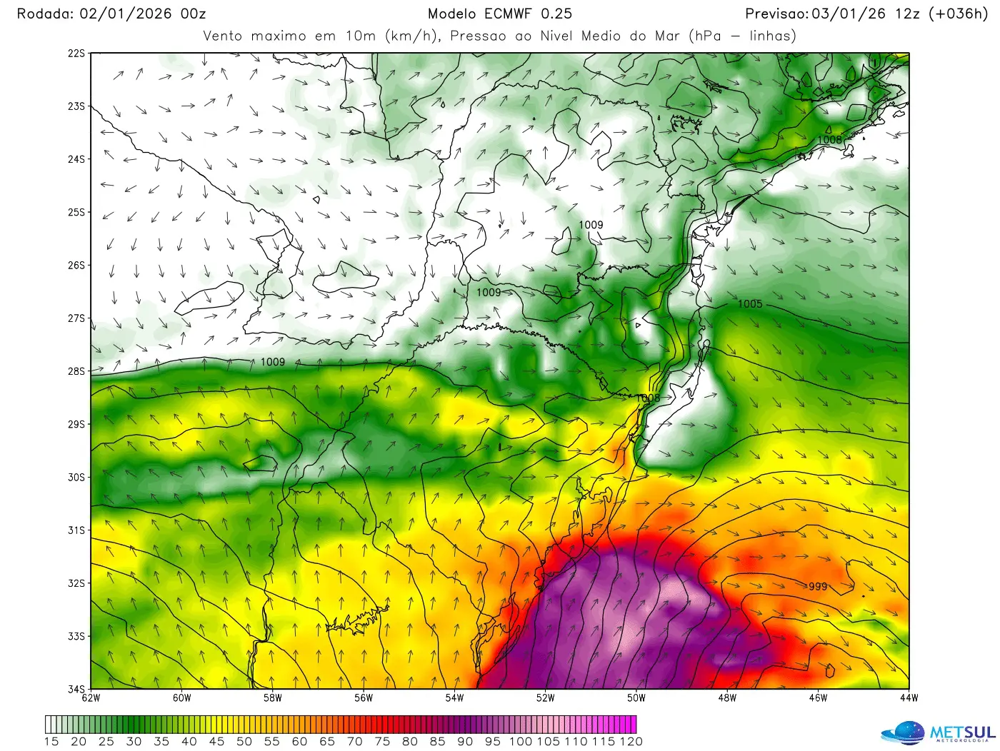 Uno de los efectos más relevantes para el país será el incremento del viento, una característica habitual en este tipo de situaciones atmosféricas durante el verano. MetSul advierte sobre la posibilidad de rachas fuertes a intensas, especialmente en zonas costeras y áreas expuestas, con mayor incidencia entre la mañana y la tarde del sábado.