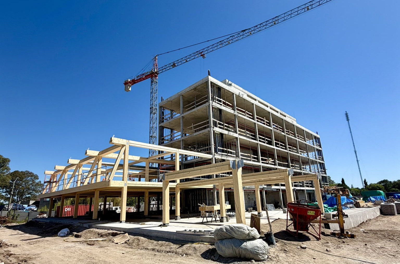 El proyecto fue mencionado públicamente por Gastón Atchugarry, director de Atchugarry Arquitectura & Construcción, quien indicó en una publicación en la red social X que se trata de un edificio de cinco niveles, con una superficie aproximada de 12.000 metros cuadrados, construido con estructura de madera laminada. Según señaló, será el edificio de mayor volumen realizado con este sistema constructivo en Uruguay.