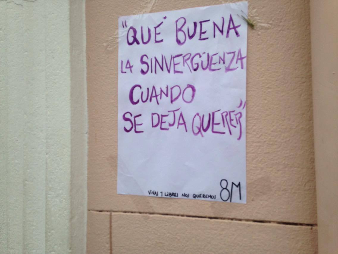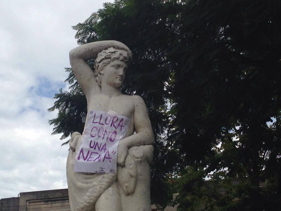 Una de las estatuas de Plaza Independencia tiene un cartel que reza «llora como una nena», otro reflexiona «a golpe se hacen los hombres». En el buzón del correo sobre calle Uruguay aparece en hoja blanca la frase estampada «si no tiene celos es porque no te quiere.» Otro cartel sentencia:»La maté porque era mía».