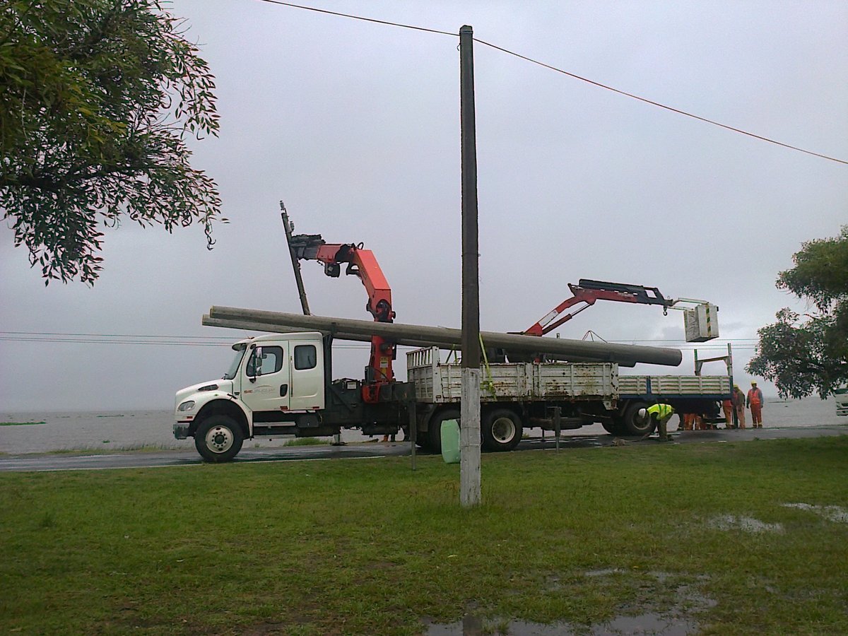 Finalmente hoy apareció una cuadrilla en el lugar, quienes acompañados por camiones grúas trabajan sobre la columna que había quedado inclinada hacia la playa.